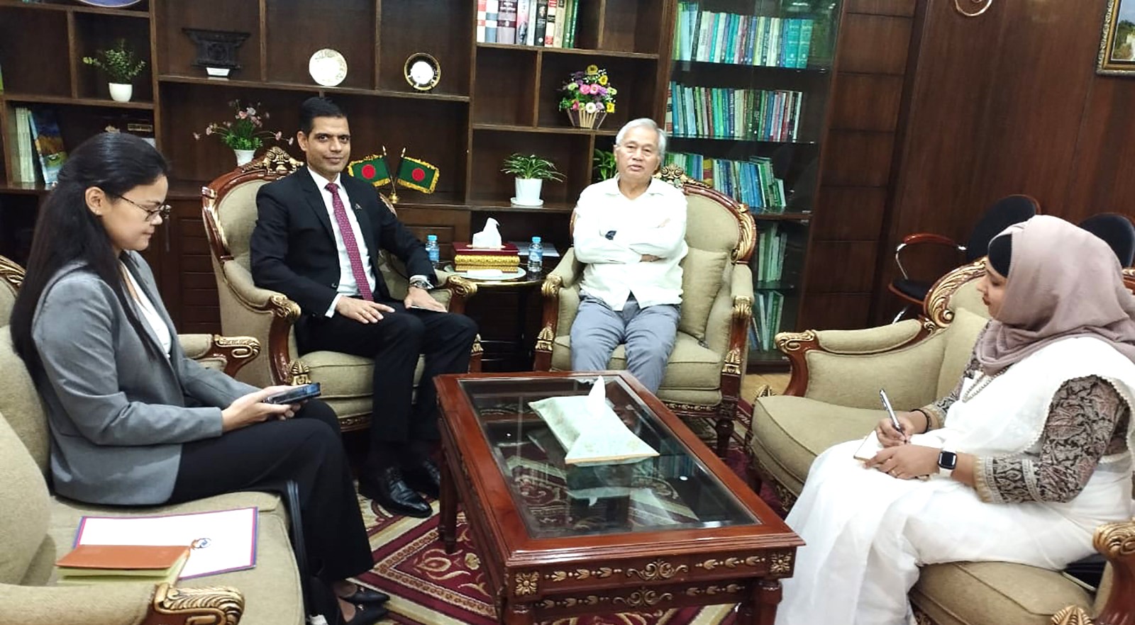 এসময় পার্বত্য চট্টগ্রাম বিষয়ক মন্ত্রণালয়ের অতিরিক্ত সচিব প্রদীপ কুমার মহোত্তম এনডিসি, উপদেষ্টার একান্ত সচিব ও মন্ত্রণালয়ের উপসচিব খন্দকার মুশফিকুর রহমান, পার্বত্য চট্টগ্রাম বিষয়ক মন্ত্রণালয়ের সিনিয়র সহকারী সচিব শুভাশিস চাকমা, নেপাল দূতাবাসের সেকন্ড সেক্রেটারি মিজ ইয়োজানা বামজান ও পররাষ্ট্র মন্ত্রণালয়ের সাউথ এশিয়া উইং-এর সহকারী সচিব মিজ তাহসিন বিনতে আনিস উপস্থিত ছিলেন।