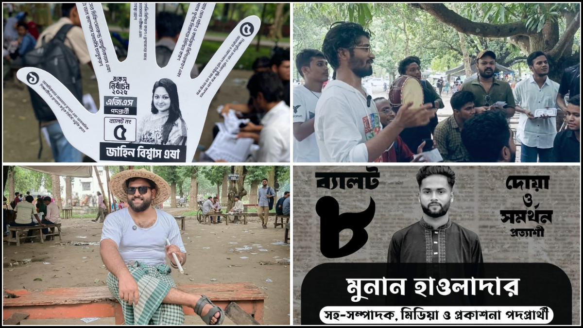 এদিকে ছাত্রদল মনোনীত প্যানেলের এজিএস প্রার্থী জাহীন বিশ্বাস এষা ব্যালট নম্বর ৫-এর সঙ্গে মিল রেখে বানিয়েছেন একটি বিশাল ‘পাঁচ আঙুল’ আকৃতির প্রচারপত্র। মোটা কাগজে তৈরি এই হাতে প্রতিটি আঙুলে লেখা আছে তার পাঁচটি প্রতিশ্রুতি। এটি দিয়ে তিনি শিক্ষার্থীদের কাছে সহজেই তার বার্তা পৌঁছে দিতে পারছেন।