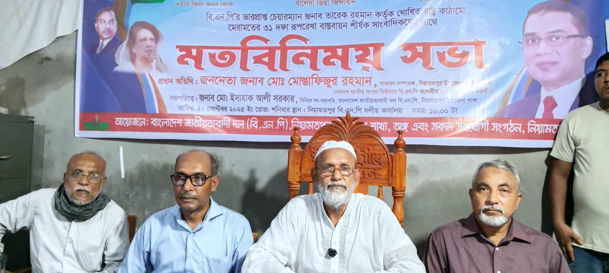 শনিবার(২০ সেপ্টেম্বর) সকালে নিয়ামতপুর উপজেলা বিএনপির দলীয় কার্যালয়ে সাংবাদিকদের সাথে ৩১ দফা রুপরেখা বাস্তবায়ন শীর্ষক মতবিনিময় সভায় তিনি এসব কথা বলেন।