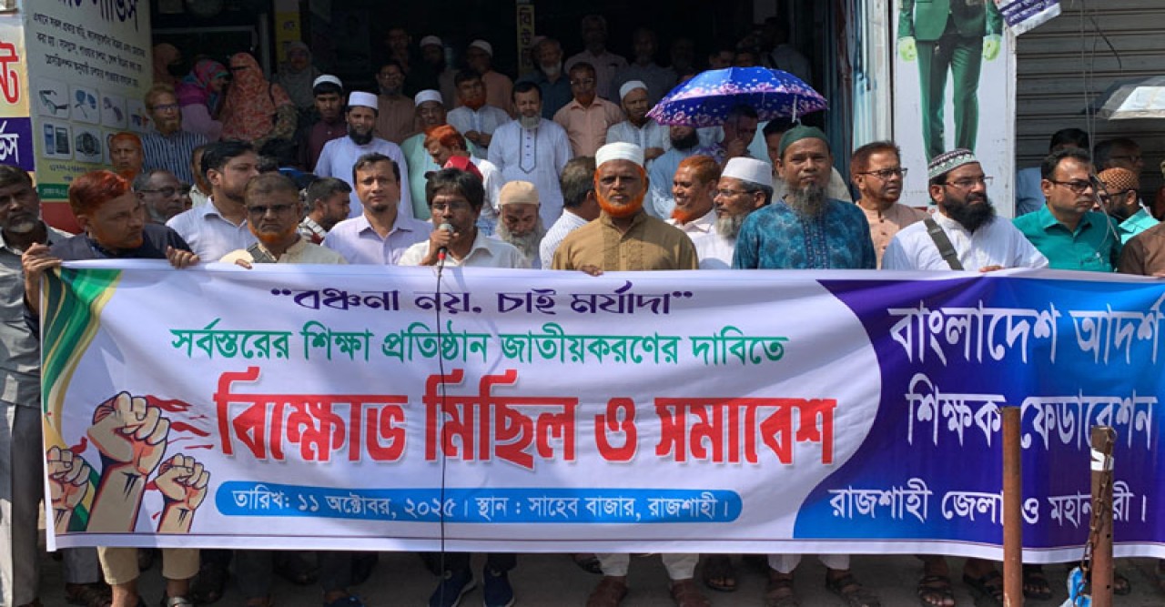 স্টাফ রিপোর্টার : ‘বঞ্চনা নয়, চাই মর্যাদা’- এই স্লোগানকে সামনে রেখে সর্বস্তরের শিক্ষাপ্রতিষ্ঠান জাতীয়করণের দাবিতে রাজশাহীতে বিক্ষোভ মিছিল ও সমাবেশ অনুষ্ঠিত হয়েছে। শনিবার সকাল ১০টার দিকে নগরের সাহেববাজার জিরোপয়েন্ট এলাকায় বাংলাদেশ আদর্শ শিক্ষক ফেডারেশনের রাজশাহী মহানগর শাখার উদ্যোগে বিক্ষোভ মিছিল বের করা হয়। পরে একটি সমাবেশ হয়।