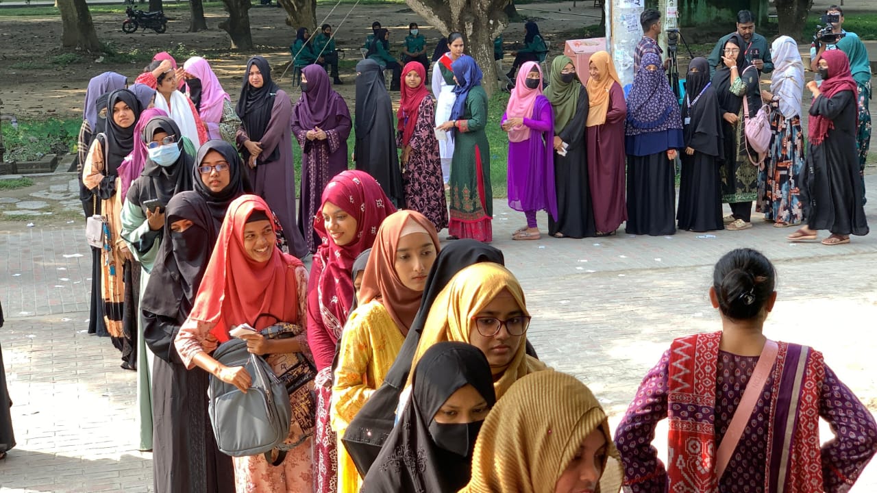 সরেজমিনে দেখা যায়, কেন্দ্রগুলোর সামনে সারিবদ্ধভাবে দাড়িয়ে শান্তিপূর্ণভাবে ভোট দিচ্ছেন ভোটাররা। তাদের মধ্যে রয়েছে উৎসবের আমেজ। পুলিশ, র্যাব, বিজিবি, বিএনসিসি, রোভার স্কাউট, কমিউনিটি পুলিশ, রেঞ্জার্স সদস্যরা ক্যাম্পাসের নিরাপত্তা ও শৃঙ্খলার দায়িত্বে নিয়োজিত রয়েছেন।