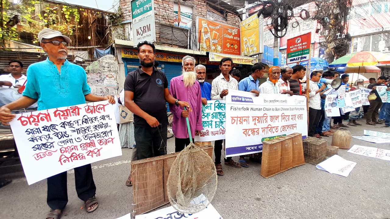 বক্তারা বলেন, বাংলাদেশ মৎস্য সুরক্ষা ও সংরক্ষণ আইন, ১৯৫০ এবং মৎস্য রক্ষা ও সংরক্ষণ বিধিমালা, ১৯৮৫ অনুযায়ী চায়না দুয়ারি ও কারেন্ট জাল ইতোমধ্যেই নিষিদ্ধ। তবুও কিছু বাণিজ্যিক মৎস্যজীবী এই জাল ব্যবহার করে নদী, খাল-বিলের দেশীয় মাছ ধ্বংস করছে এবং ঐতিহ্যবাহী জেলে সম্প্রদায়কে জীবিকার সংকটে ফেলছে। এ ব্যাপারে কঠোর পদক্ষেপ নিতে হবে।