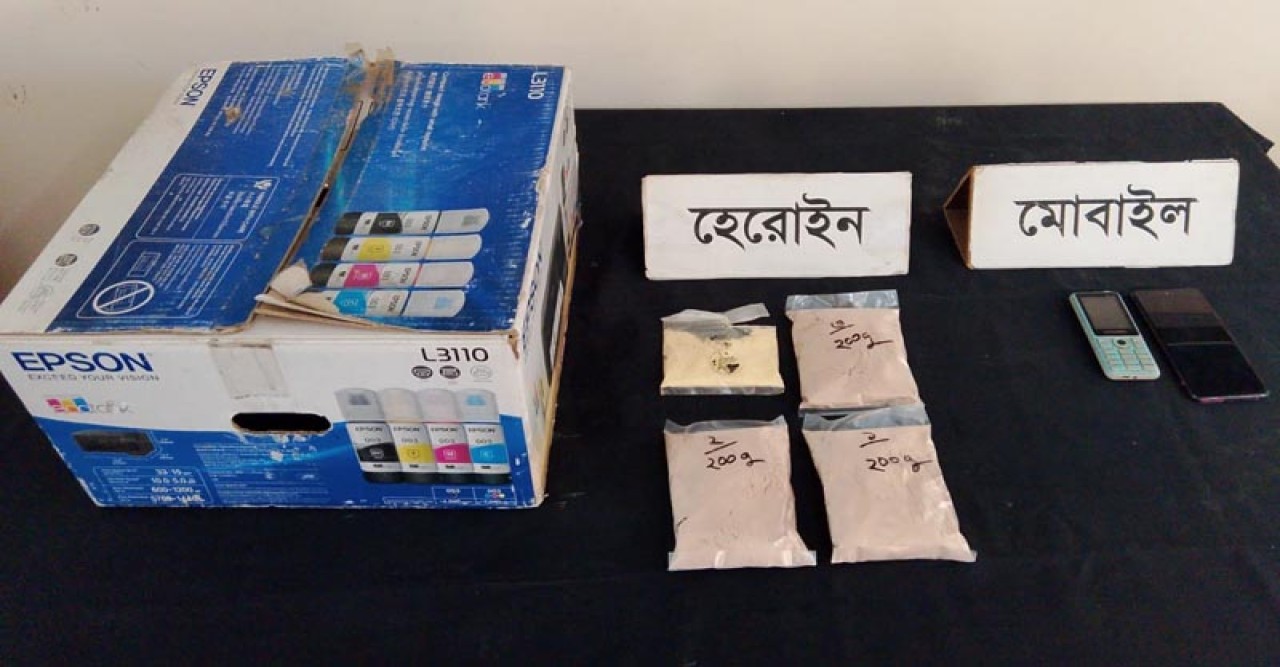 গ্রেপ্তার দুজন হলেন: রাজশাহীর গোদাগাড়ী উপজেলার দিয়ারমানিকচক মধ্যপাড়ার বাসিন্দা মো. আসারুল ওরফে রনি (২১) এবং সিরাজগঞ্জের রেলকলোনীর বাসিন্দা জাহানারা বেগম (৫০)। এ সময় তাদের কাছ থেকে ৬৪০ গ্রাম হেরোইন, একটি নষ্ট প্রিন্টার এবং দুটি মোবাইল ফোন জব্দ করা হয়।