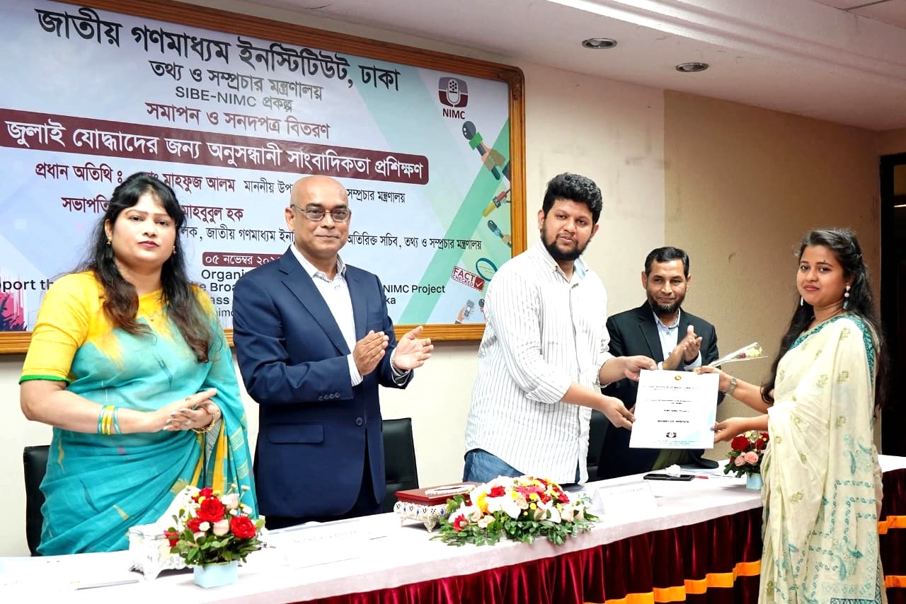 সমাপনী ও সনদ বিতরণ অনুষ্ঠানটি সঞ্চালনা করেন জাতীয় গণমাধ্যম ইনস্টিটিউটের সহকারী পরিচালক তানজিম তামান্না। অনুষ্ঠানের শেষে প্রশিক্ষণে অংশ নেওয়া ১৬ জন জুলাই যোদ্ধাকে সনদপত্র প্রদান করা হয়। সমাপন ও সনদ বিতরণ অনুষ্ঠানে জাতীয় গণমাধ্যম ইনস্টিটিউটের কর্মকর্তারা উপস্থিত ছিলেন।