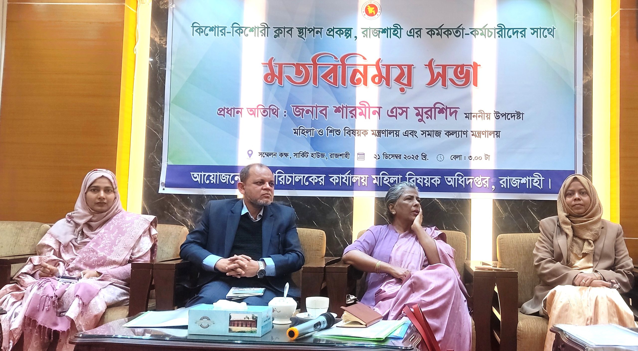 স্টাফ রিপোর্টার : রোববার (২১ ডিসেম্বর) রবিবার বিকালে রাজশাহী সার্কিট হাউজে সমাজকল্যাণ এবং মহিলা ও শিশু বিষয়ক উপদেষ্টা শারমীন এস মুরশিদ ‘কিশোর-কিশোরী ক্লাব স্থাপন প্রকল্প’-এর কর্মকর্তা-কর্মচারীদের সাথে মতবিনিময় করেছেন। রাজশাহী মহিলা বিষয়ক অধিদপ্তর এ মতবিনিময় সভার আয়োজন করে। সভায় প্রধান অতিথি হিসেবে উপদেষ্টা কিশোর-কিশোরী ক্লাব স্থাপন প্রকল্পের কর্মকর্তা-কর্মচারীদের বিভিন্ন বিষয়ে খোঁজখবর নেন এবং বিভিন্ন দিক-নির্দেশনা প্রদান করেন।