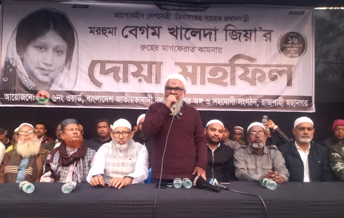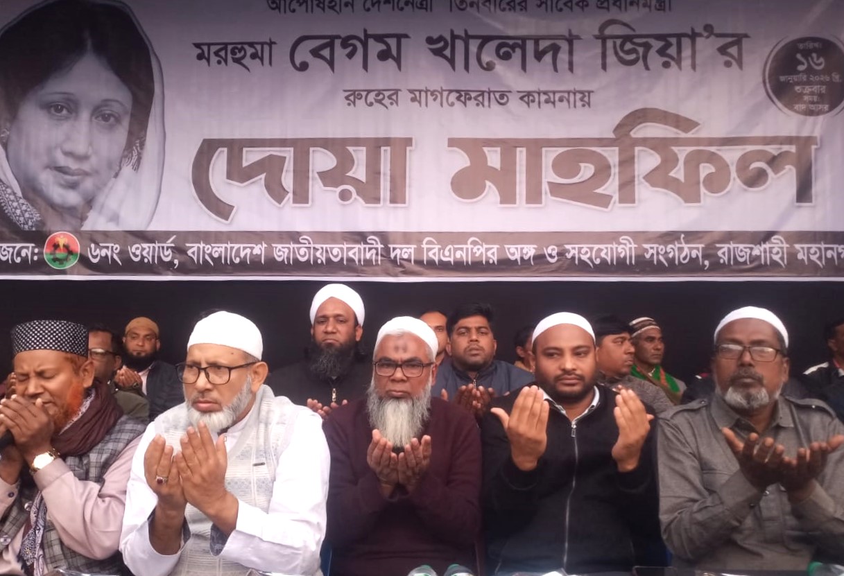 স্টাফ রিপোর্টার : রাজশাহী নগরীর রাজপাড়া থানার ৬ নং ওয়ার্ড বিএনপি, অঙ্গ ও সহযোগী সংগঠনের আয়োজনে তিনবারের প্রধানমন্ত্রী, আপোষহীন দেশনত্রী মরহুমা বেগম খালেদা জিয়ার রুহের মাগফেরাত কামনা করে দোয়া মাহফিলের আয়োজন করা হয়।