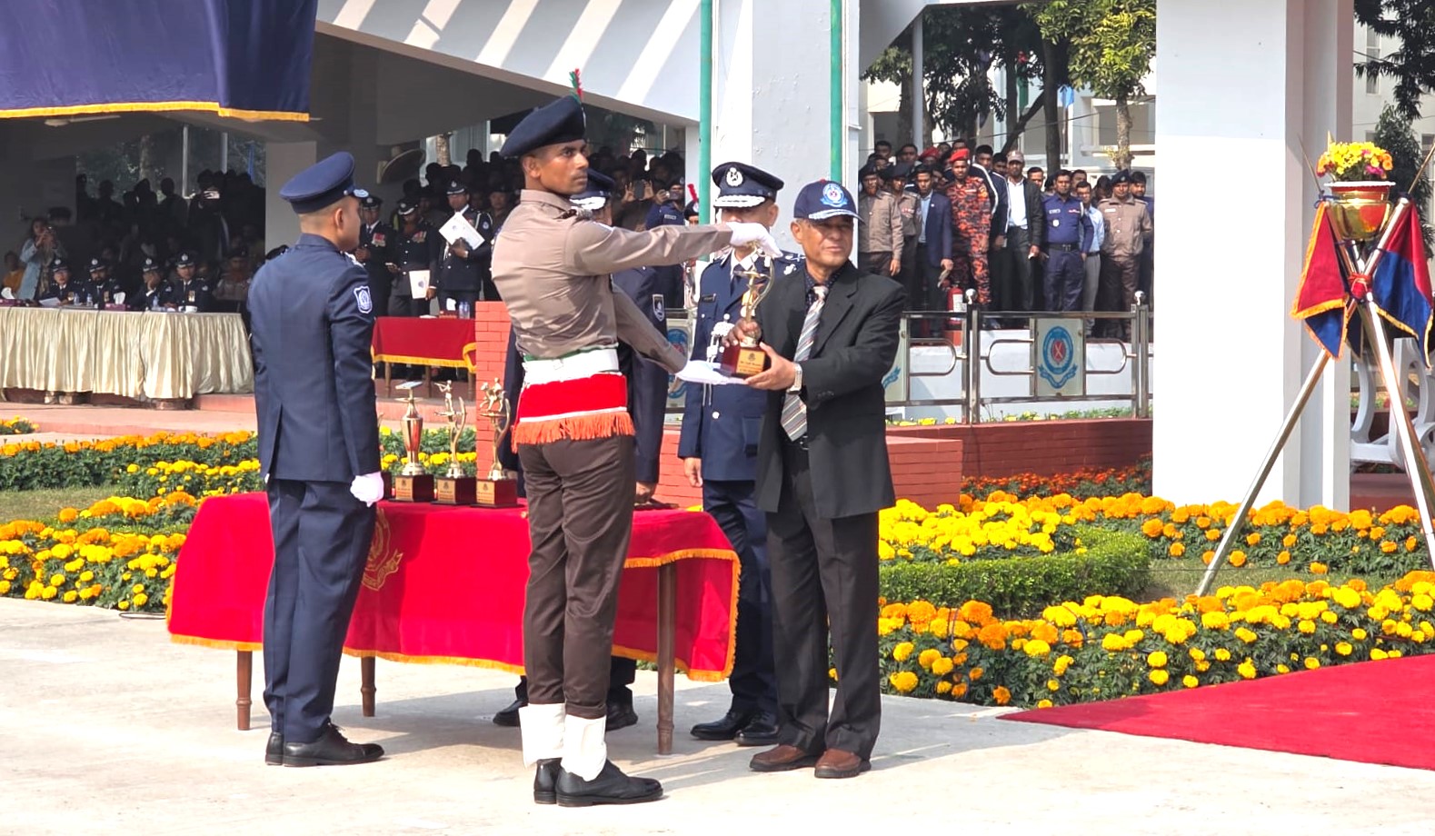 এর আগে অনুষ্ঠানে প্রধান অতিথি হিসেবে উপস্থিত থেকে কুচকাওয়াজের অভিবাদন গ্রহণ করেন স্বরাষ্ট্র উপদেষ্টা মোঃ জাহাঙ্গীর আলম চৌধুরী।