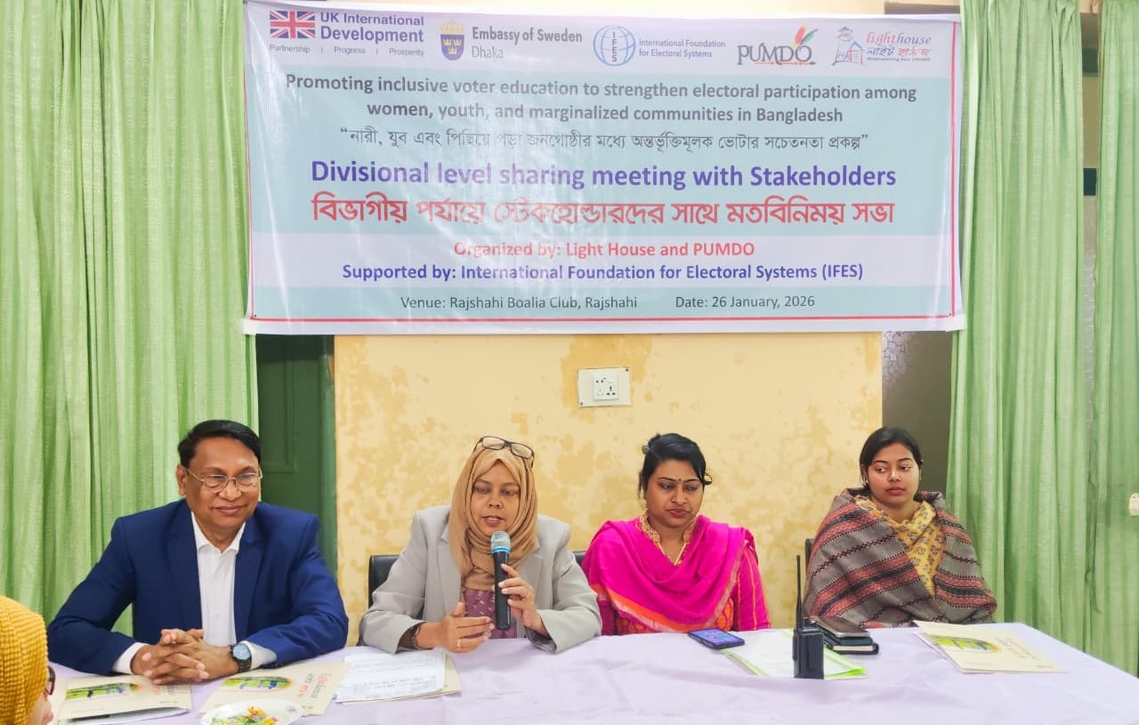 ভোটারদের মধ্যে সচেতনতা বৃদ্ধির লক্ষ্যে সোমবার (২৬ জানুয়ারি) বেলা ১২টায় নগরীর বোয়ালিয়া ক্লাব মিলনায়তনে বিভাগীয় পর্যায়ে স্টেকহোল্ডারদের সঙ্গে ভোটার শিক্ষা বিষয়ক মতবিনিময় সভায় এসব কথা বলেন বক্তারা। ‘নারী, যুব ও পিছিয়ে পড়া জনগোষ্ঠীর মধ্যে অন্তর্ভুক্তিমূলক ভোটার সচেতনতা প্রকল্প’-এর আওতায় সভাটির আয়োজন করে মানবাধিকার সংগঠন লাইট হাউজ। আগামী ১২ ফেব্রুয়ারি অনুষ্ঠিতব্য ত্রয়োদশ জাতীয় সংসদ নির্বাচন উপলক্ষে আয়োজিত এই সভায় ভোটার শিক্ষা, নির্বাচন পর্যবেক্ষণ ও নাগরিক অংশগ্রহণের গুরুত্ব তুলে ধরা হয়।