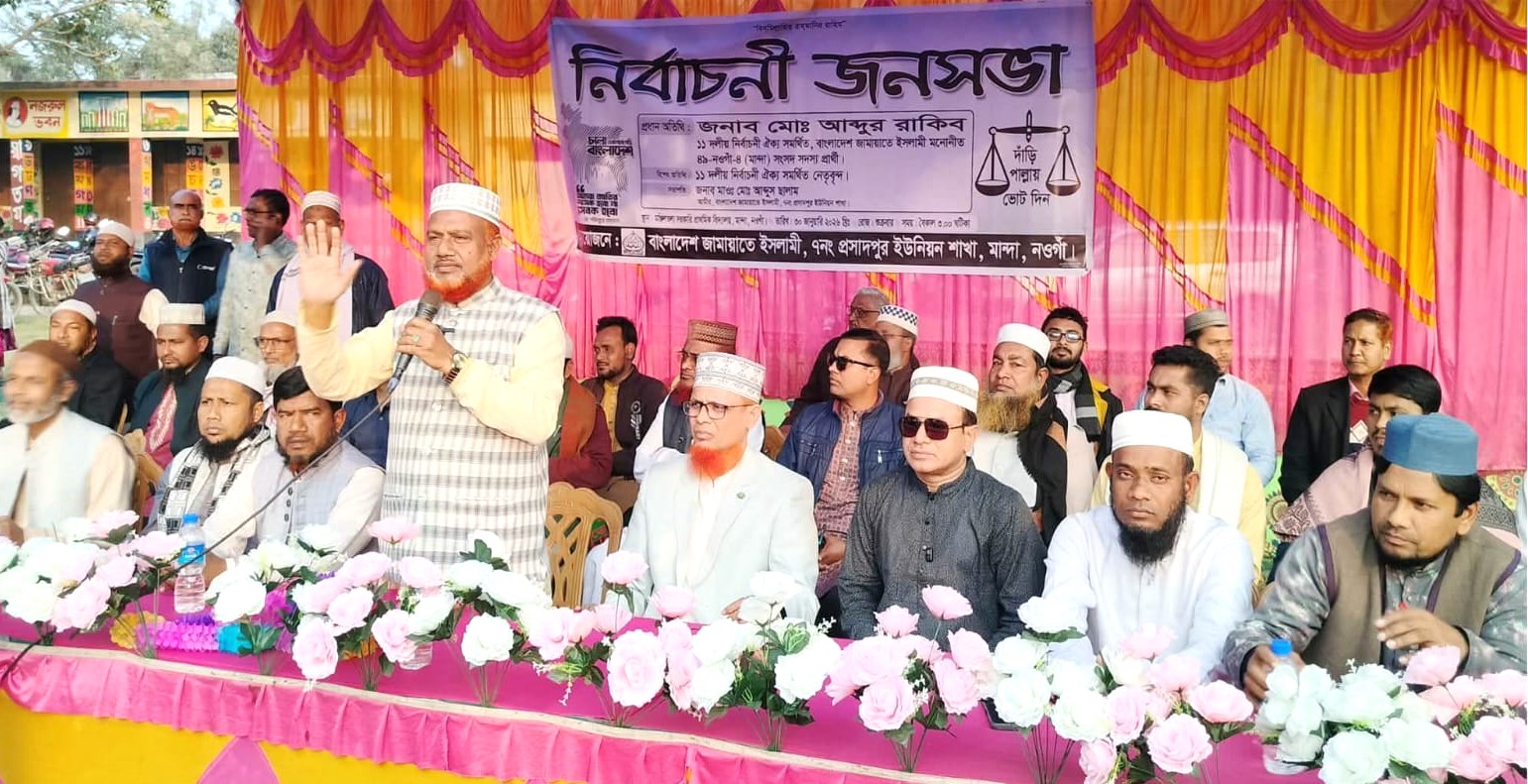 মান্দা প্রতিনিধি : নওগাঁর মান্দা উপজেলার প্রসাদপুর ইউনিয়নের মঞ্জিলতলা বাজারে ১১ দলীয় জোটের উদ্যোগে নির্বাচনী জনসভা অনুষ্ঠিত হয়েছে। আজ শুক্রবার (৩০ জানুয়ারি) বিকেলে আয়োজিত জনসভায় প্রধান অতিথি ছিলেন নওগাঁ জেলা জামায়াতের আমীর ও জামায়াত মনোনীত এমপি প্রার্থী খন্দকার আব্দুর রাকিব।এতে সভাপতিত্ব করেন বাংলাদেশ জামায়াতে ইসলামী প্রসাদপুর ইউনিয়নের আমীর আব্দুস সালাম।