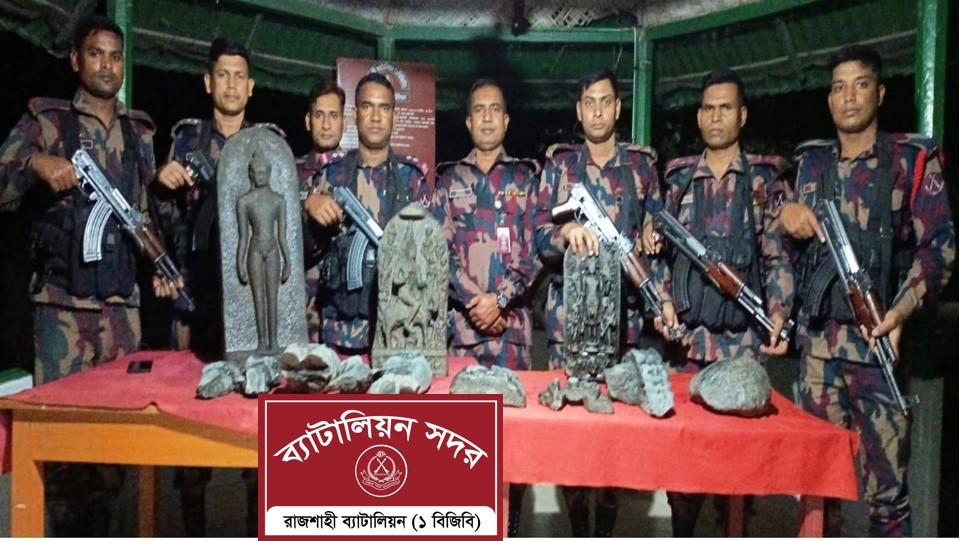 সংবাদ বিজ্ঞপ্তি : রাজশাহী ব্যাটালিয়ন (১ বিজিবি) এর একটি আভিযানিক মঙ্গলবার (১০ মার্চ) রাত আনুমানিক ৩০ মিনিটে গোদাগাড়ী থানার ফুলতলা বালুরঘাট এলাকার পদ্মা নদীর চরে অভিযান চালিয়ে ৬২ কেজি ৫০০ গ্রাম ওজনের একটি বৌদ্ধ মূর্তি, ৩০ কেজি ৬০০ গ্রাম ওজনের ০১টি বাসন্তি মূর্তি, ১০ কেজি ৮০০ গ্রাম ওজনের ১টি বিষ্ণু মূর্তি।