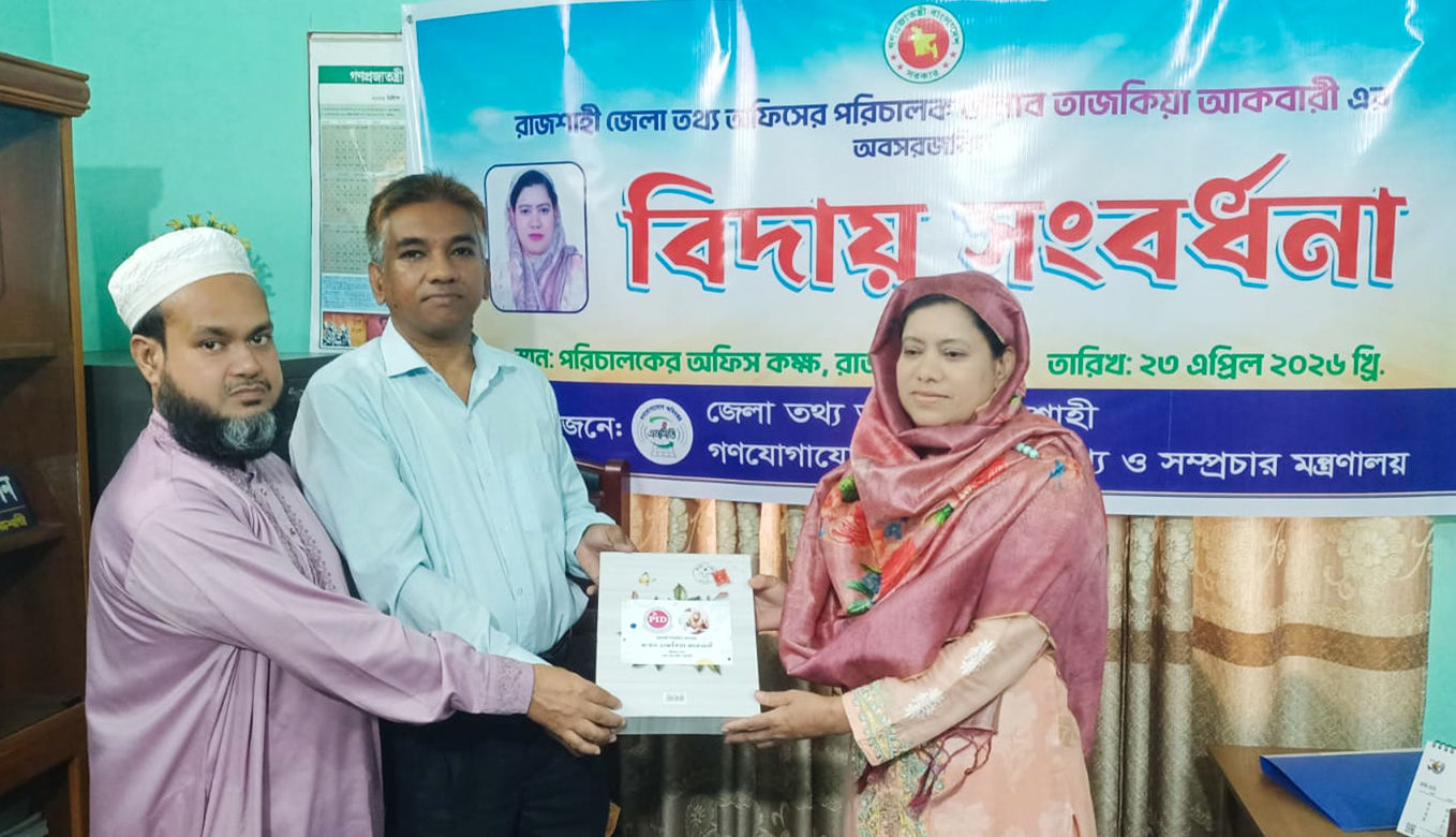 স্টাফ রিপোর্টার : রাজশাহী জেলা তথ্য অফিসের পরিচালক তাজকিয়া আকবারী’র অবসরজনিত বিদায় সংবর্ধনা বৃহস্পতিবার (২৩ এপ্রিল) দপ্তরটির সম্মেলন কক্ষে অনুষ্ঠিত হয়েছে। চলতি মাসের ১৬ তারিখে ৫৯ বছর বয়স পূর্তিতে তিনি অবসরে যান। দপ্তরটির কর্মকর্তা-কর্মচারী এবং রাজশাহী পিআইডির কর্মকর্তারা বিদায় অনুষ্ঠানে উপস্থিত ছিলেন।