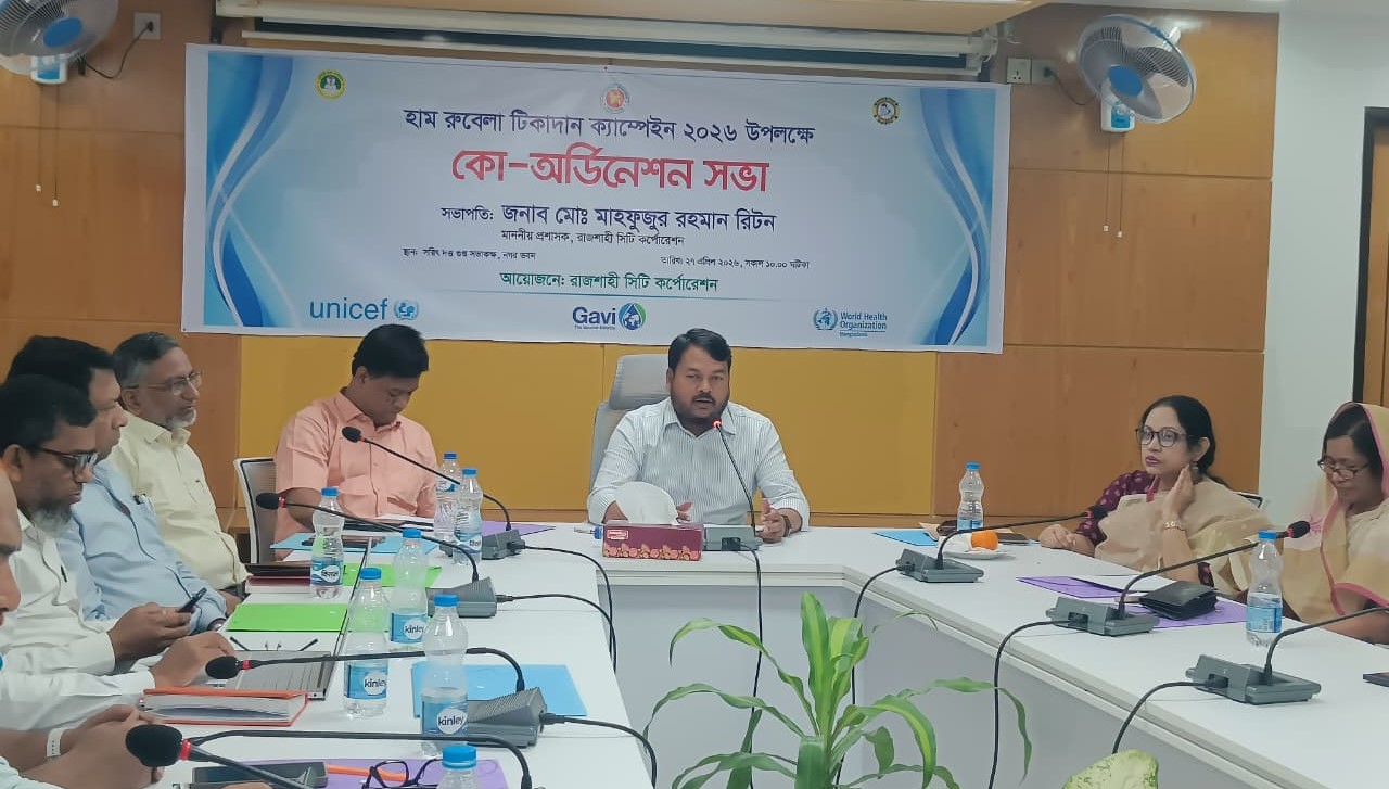 স্টাফ রিপোর্টার : রাজশাহী সিটি কর্পোরেশনের আয়োজনে হাম-রুবেলা টিকাদান ক্যাম্পেইন-২০২৬ উপলক্ষে কো-অর্ডিনেশন সভা অনুষ্ঠিত হয়েছে। সোমবার (২৭ এপ্রিল) নগর ভবনের সরিৎ দত্তগুপ্ত নগর সভাকক্ষে আয়োজিত সভায় সভাপতিত্ব করেন রাজশাহী সিটি কর্পোরেশনের প্রশাসক মোঃ মাহফুজুর রহমান রিটন। সভায় তিনি হাম-রুবেলা টিকাদান ক্যাম্পেইন সফলভাবে বাস্তবায়নে সংশ্লিষ্টদের বিভিন্ন দিক-নির্দেশনা প্রদান করেন।